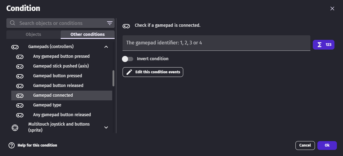 - If your game is multi player, it's a good idea to use the Gamepad connected condition to check which gamepads are connected. You could store in a variable the gamepad number associated to a player. You can also force the first player to use the Gamepad 1, and the other player to use Gamepad 2.