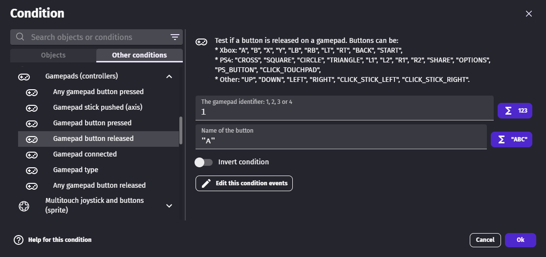 Use the condition "Type of gamepad" or the expression Gamepads::GamepadType(gamepadNumber) to identify the kind of controller connected (Xbox, PS4, Steam Deck, etc.). This lets you display the correct button icons in your UI — for example, showing a cross button for PlayStation players and an A button for Xbox players.