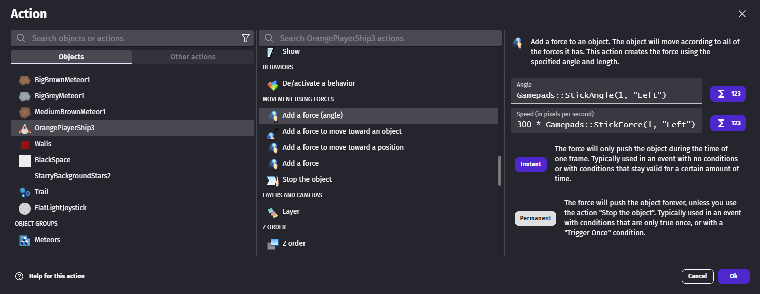 Gamepads::StickAngle(gamepadNumber, stick)— angle the stick is pushed toward (in degrees).Gamepads::StickForce(gamepadNumber, stick)— overall force/magnitude of the stick push (0 to 1).Gamepads::StickForceX(gamepadNumber, stick)— horizontal axis of the stick (−1 = fully left, 1 = fully right).Gamepads::StickForceY(gamepadNumber, stick)— vertical axis of the stick (−1 = fully up, 1 = fully down).